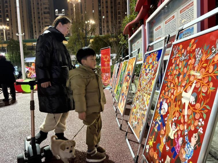市民们围聚在年画展前,一边欣赏,一边交流着对年画的理解和感受。小朋友们更是被年画的鲜艳色彩和有趣故事所吸引,眼中充满了好奇与喜悦,在文明实践志愿者的讲解下,他们对年画这一传统艺术形式有了更深的认识。